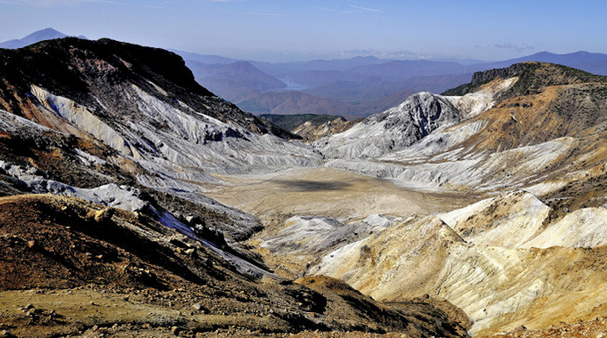明治33年(1900年)の大爆発によってできた巨大な噴火口の「沼ノ平火口」周辺は、荒々しい山肌に囲まれ月世界のような景色が見られます。