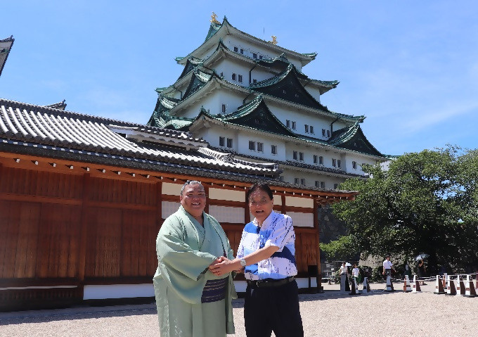 木曽川〇なごやの水応援大使 御嶽海関と名古屋市長(名古屋城を背景に)