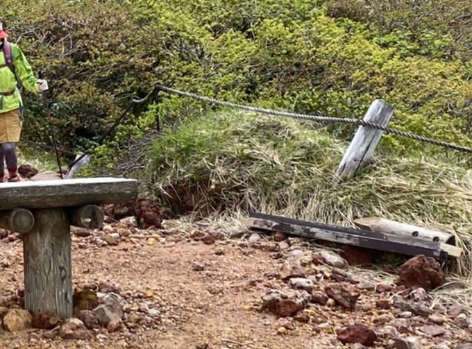 倒れた杭や登山道に設置されているベンチの復旧も行います。