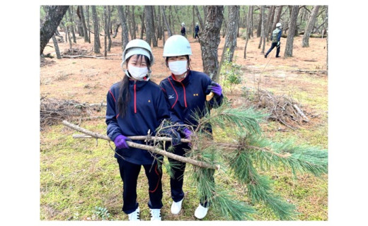 虹の松原の再生・保全活動では、人手が不足している場所の草刈りや松の生育環境を守るために必要な広葉樹の伐採、松くい虫の被害を広めないための松の枯れ枝の処分を行っています。また、子どもたちの感性を育む教育活動の強化や、虹の松原のファンを増やすための広報活動にも力を入れています。