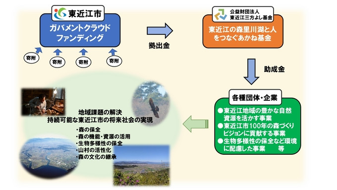 目標金額を達成できた場合も未達成の場合も、皆様から寄せられた貴重な寄附金を「東近江の森里川湖と人をつなぐあかね基金」で活用されるよう、東近江市から公益財団法人東近江三方よし基金に対して拠出します。