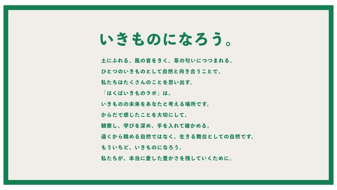 はくばいきものラボでは、これらの取組を通じて、参加者自身も一つの”いきもの”として生態系に関わり身体で学びながら、生物多様性の回復を推進していきます。