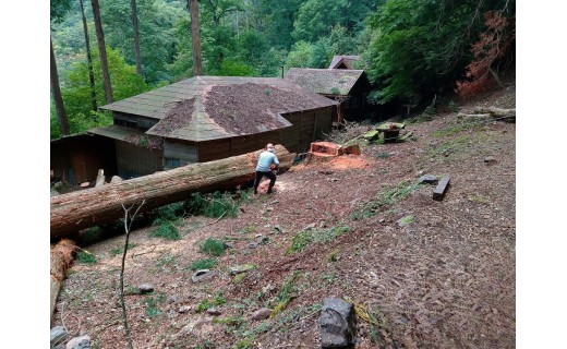 解体撤去工事には、重機を使用するため周辺の整備が必須でありました。そこで関係者17名で入山し、既存施設周辺の森林伐採整備を実施しました。これで解体撤去工事ができる環境が整いました。