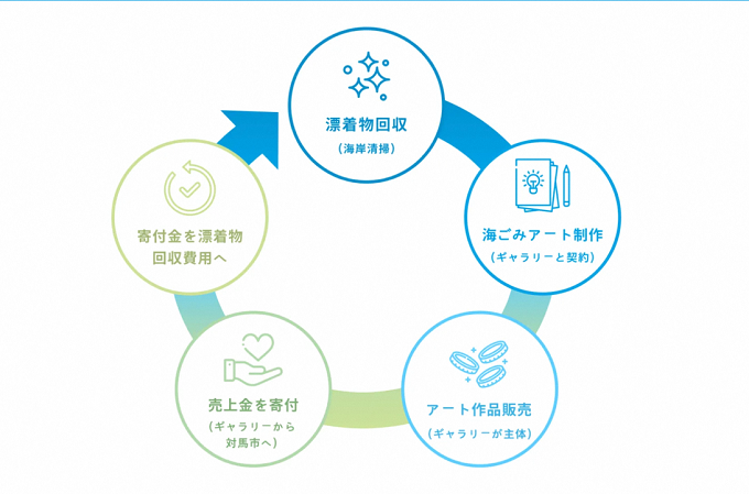 制作するのは、「ごみを資源に」「いきものを未来へ」という思いを形にする地元事業者です。継続的な海岸清掃や廃プラスチックの回収・再生を通じ、障がいのある方々とのアート制作や、海外への環境啓発など、対馬の課題解決と魅力発信に取り組んでいます。