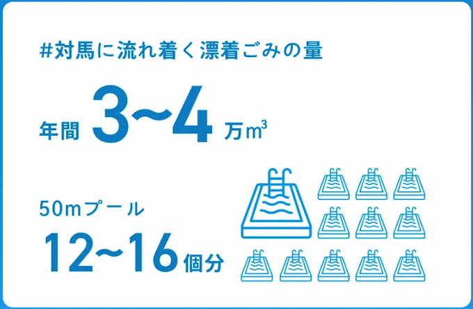 さて、対馬は日本一海ごみが流れ着く島と言われておりまして、その量は毎年約4万㎥(重さにして約900トン)と言われていますが、回収・処理できているのはそのうちの約8,000㎥にとどまっています。詳細は後述しますが、限られた予算の中では海ごみ回収が追い付かず、対馬の海岸にはごみがたまり続けています。