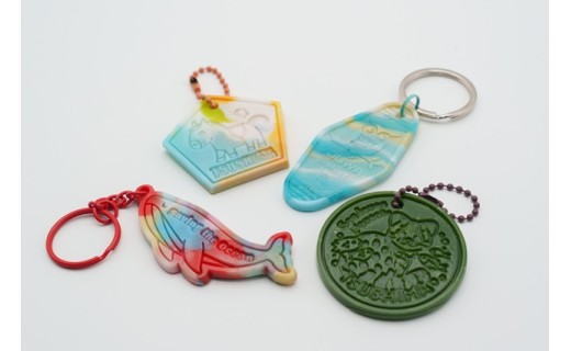 本返礼品は、再生プラスチックを使用し、一つひとつ手作りで生産していますので色や柄、模様はすべて異なり、個体差がございます。お手元に届くキーホルダーは掲載画像と同一のものではありません。世界に一つだけの風合いとしてお楽しみください。