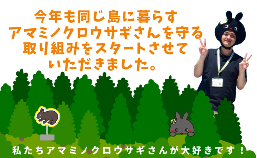 私たち徳之島町では島民とアマミノクロウサギさんが共生できる島を目指し、今年もロードキル(交通事故)や農作物への被害を解決するために全力で取り組んでいきます。